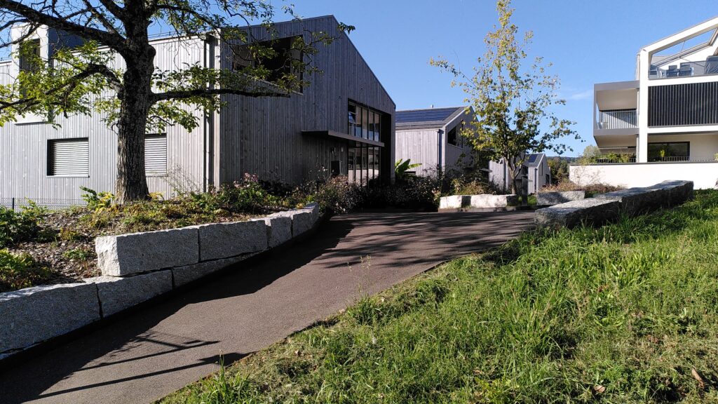Certains bâtiments prévus ont déjà été construits, alors que d’autres sont encore en cours de procédure d’autorisation de construire. Le cheminement piétonnier a été réalisé.